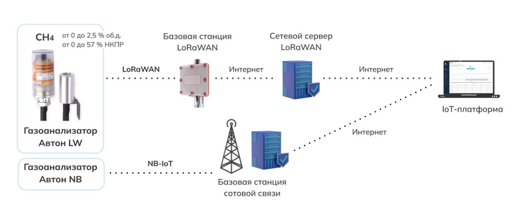 | Беспроводные автономные газоанализаторы регистрируют концентрацию газа в воздухе | → | Полученные данные передаются на базовую станцию посредством LoRaWAN или NB-IoT | → | Далее — на аналитическую IoT-платформу для дальнейшего мониторинга |