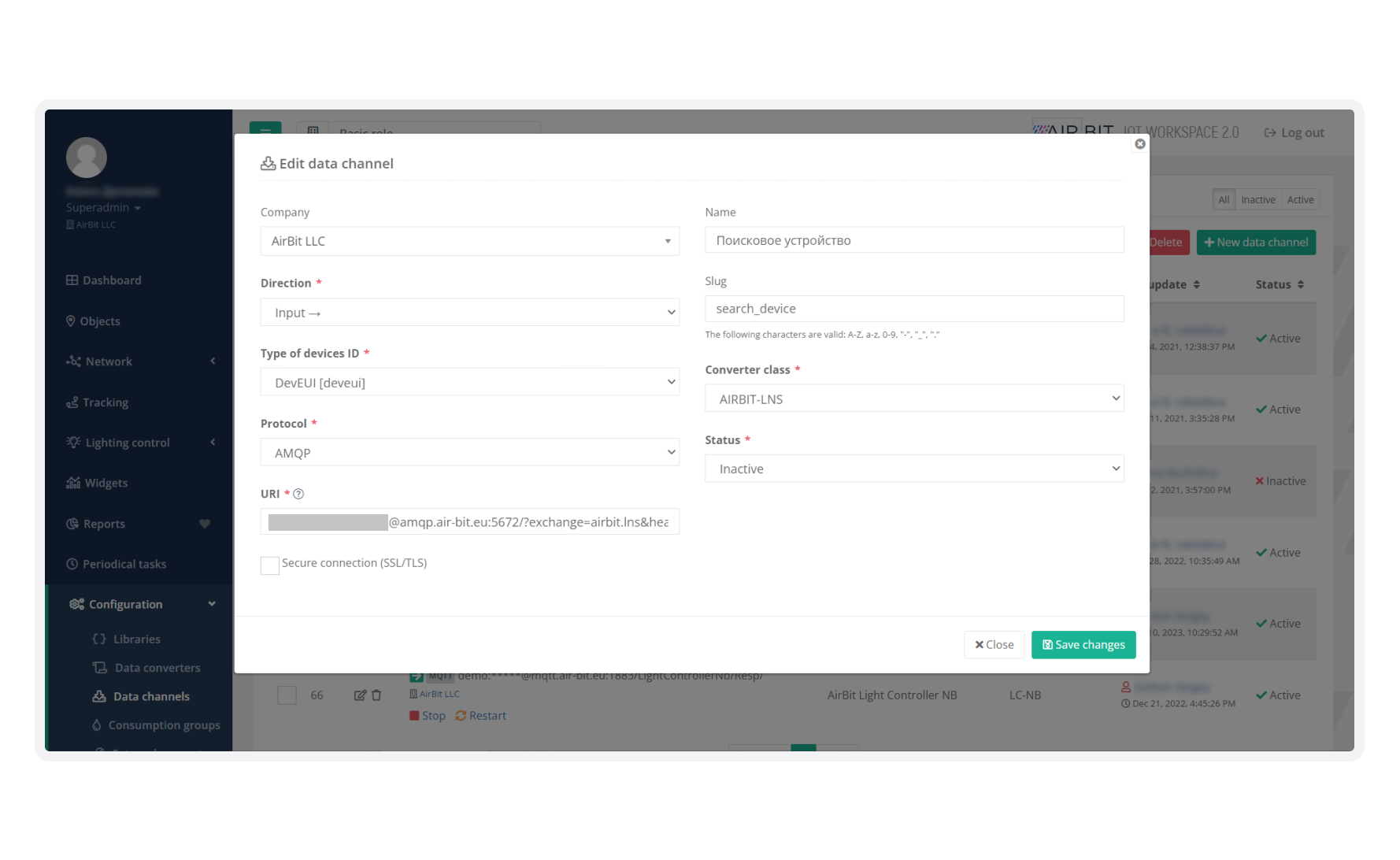 Взаимодействие конечных устройств с платформой AirBit IoT Workspace начинается с их подключения — создания канала для получения и отправки данных с / на различные сервисы или источники, например, сетевой сервер LoRaWAN, MQTT-брокер, по выбранному протоколу: HTTP; MQTT; AMQP.
